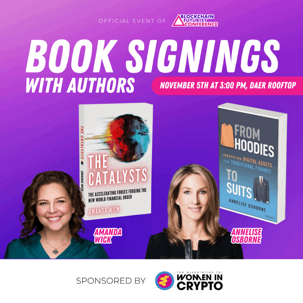 Meet the authors behind two of the most talked-about new releases in blockchain, startups, and finance at Blockchain Futurist Conference Florida 2025. Join Amanda Wick (The Catalysts) and Annelise Osborne (From Hoodies to Suits), for an intimate book signing and conversation on innovation, leadership, and the future of finance. Don’t miss your chance to meet the authors and take home signed copies of their books.