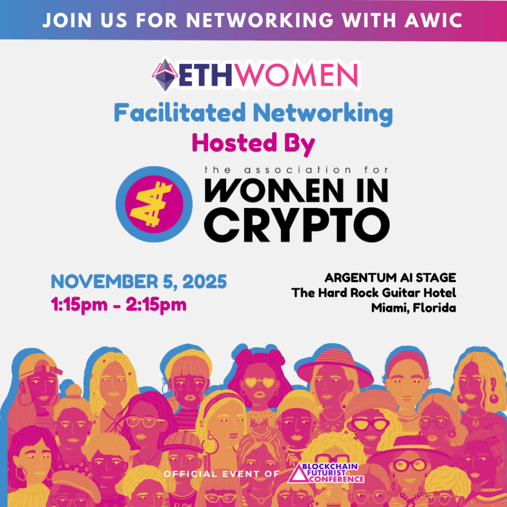 Join the Association for Women in Crypto (“AWIC”) for a guided networking session presented by ETHWomen, an official segment of Blockchain Futurist Conference Florida 2025. Designed to foster meaningful connections among women and allies in Web3, this session features structured conversations and facilitated introductions to help participants share insights, build relationships, and explore opportunities across blockchain, crypto, and emerging technologies.